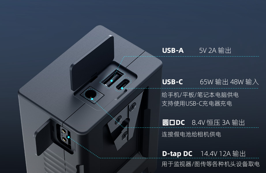标称电压14.4V的V口电池同时也提供了一个5.5/2.1mm圆形 DC接口恒压8.4V/3A输出,用于相应电压的机头设备取电,特别是可以配合各种假电池给相机长时间供电。