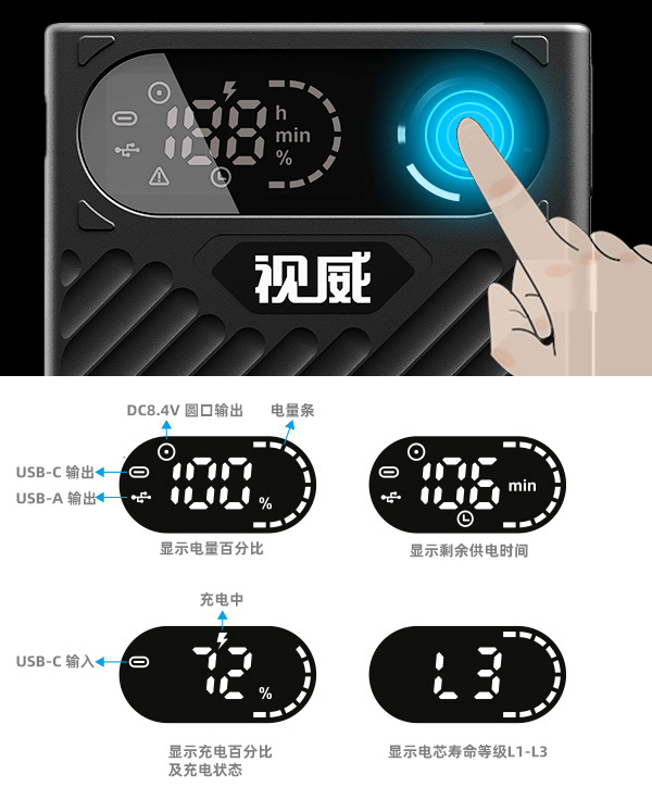 配备LED屏,可显示当前电量百分比和剩余使用时间。采用轻触感应按钮,可以消除拍摄过程中按压电池所引起的任何干扰。长按此按钮还可显示电池的健康状况。