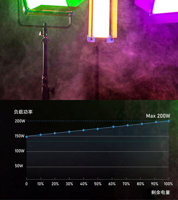 即使在电量接近耗尽时,MC99电池也能输出至少150W的功率。而在满电状态下,负载功率高达200W,除了摄影机以外,还能很轻松为各种常用的高功率灯具供电。